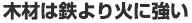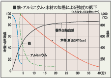 木材が鉄より火に強いと言ったら「そんなはずはない」と思われるかもしれません。確かに、木材は燃えますし、鉄は燃えません。しかし、木材もある程度の厚さや太さがあれば表面が焦げるだけで、それ以上はなかなか燃えません。鉄は温度が250度になると変形しはじめ、5分もたたないうちに元の強さの半分になってしまいますが、木材が元の強さの半分になるのには20分もかかります。 |
