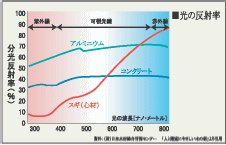 木のインテリアが、有害な紫外線を吸収することはあまり知られていないようです。人間の目には反射率50〜60%が最も心地よいとされています。ヒノキや杉の反射率は、ちょうど50〜60%で、とても目に優しい素材なのです。また、木材から反射される光には、紫外線が少なく、反対に赤外線が多いという特徴があります。 |