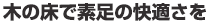 帰宅して、靴と靴下を脱いで素足になると、何となくほっとしたような開放感を覚えます。また、足の裏をもんだり温めたりすると気分がリラックスするように、足の裏から伝わる感触や情報は、直接脳に伝達されると言われています。杉のように比重が軽い木ほど、あたたかく感じられます。厚くするほど断熱性は増し、あたたかさも増します。また滑りにくいので、お年寄りや小さなお子様のいる場合でも安心です。 |