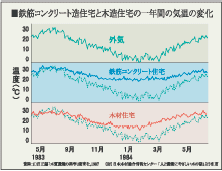 鉄筋コンクリート造住宅は、冬は暖かいのですが、夏は外気と同じ室温になっています。木造住宅は外気温と比較したとき、夏涼しく冬暖かくなっているのがわかります。 |